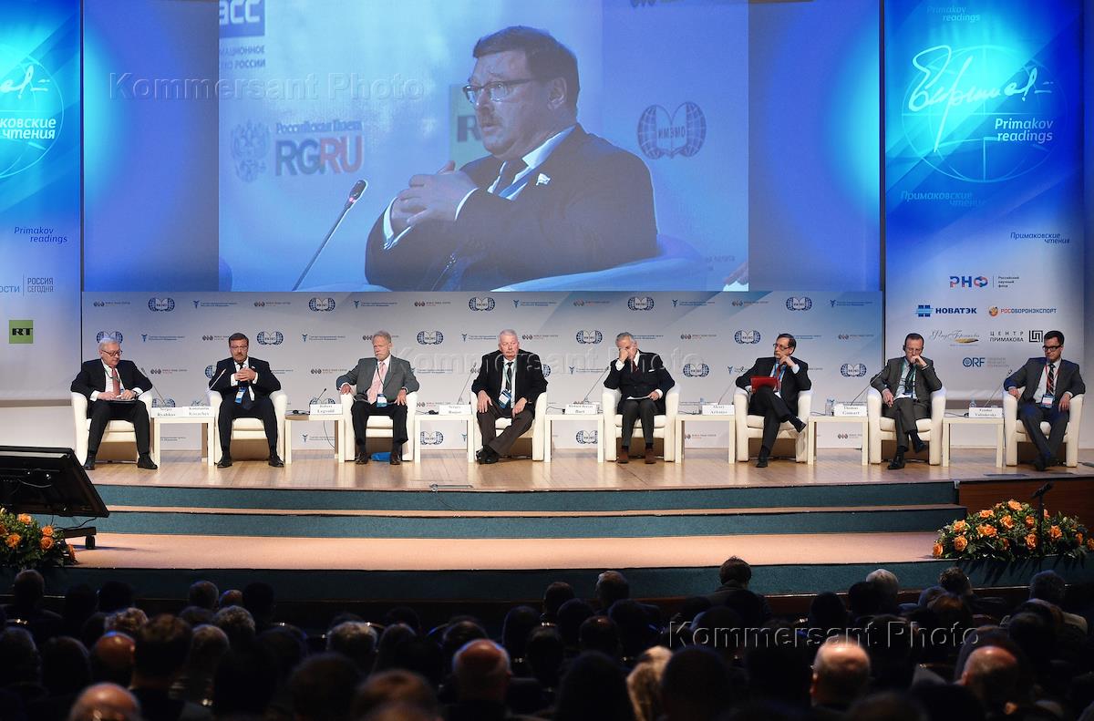 III Международный научно-экспертный форум "Примаковские чтения" прошел в Центре международной торговли (ЦМТ). Председатель комитета Совета Федерации России по международным делам Константи Косачев (слева) во время форума.
