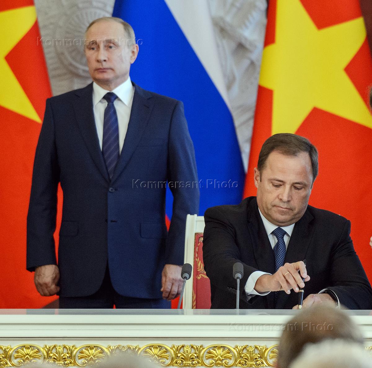 The meeting of President of Russia Vladimir Putin with the President of Vietnam Tran Dai Quang was held in the Kremlin. The President of Russia Vladimir Putin(from left) and the President of Vietnam Tran Dai Quang( from right) during the meeting.