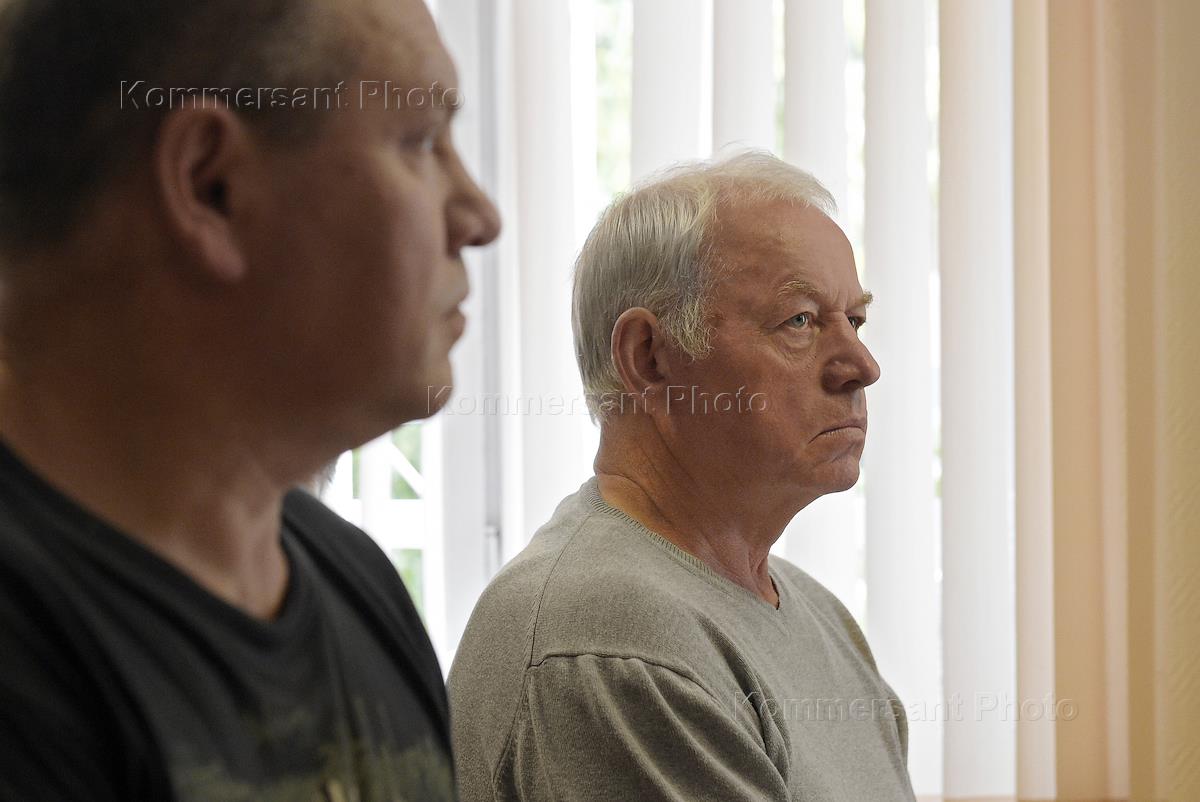 Фигуранты дела о катастрофе самолета в аэропорту Внуково, в которой погиб глава французской нефтегазовой компании Total Кристоф де Маржери инженер аэродромной службы Владимир Леденев (слева) и водитель снегоуборочной машины Владимир Мартыненко (справа) во время заседания в Солнцевском суде.