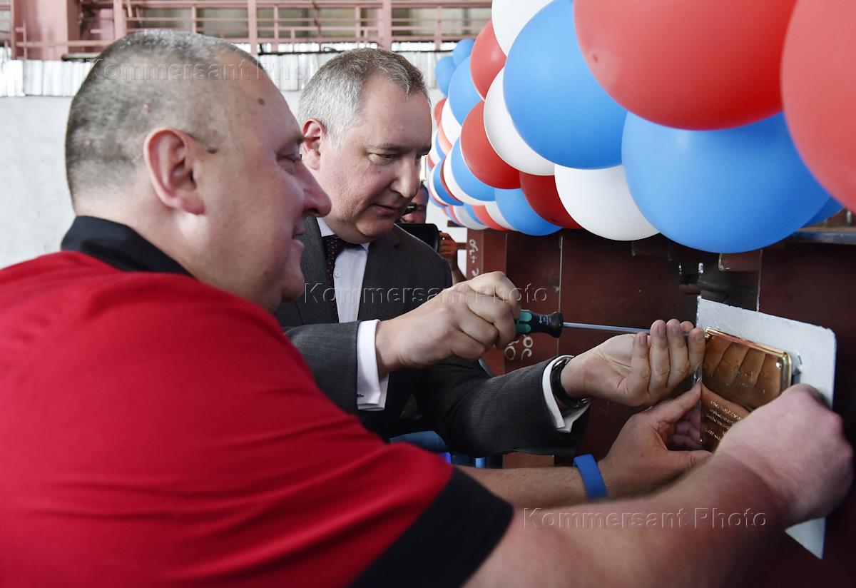 Заместитель председателя Правительства России Дмитрий Рогозин (в центре) и первый заместитель председателя Коллегии Военно-промышленной комиссии при президенте России Иван Харченко (справа) во время посещения судостроительного завода "Залив" и участия в торжественной церемонии закладки малого гидрографического судна проекта 19910.