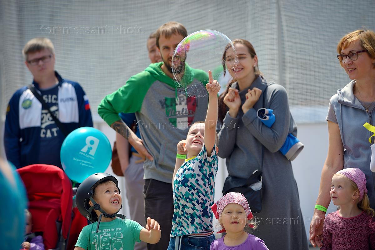 Мальчик лопает большой мыльный пузырь на фестивале городской среды "Всё просто" в будущем центре креативных индустрий Svoboda2 на площадке бывшего завода оргстекла.