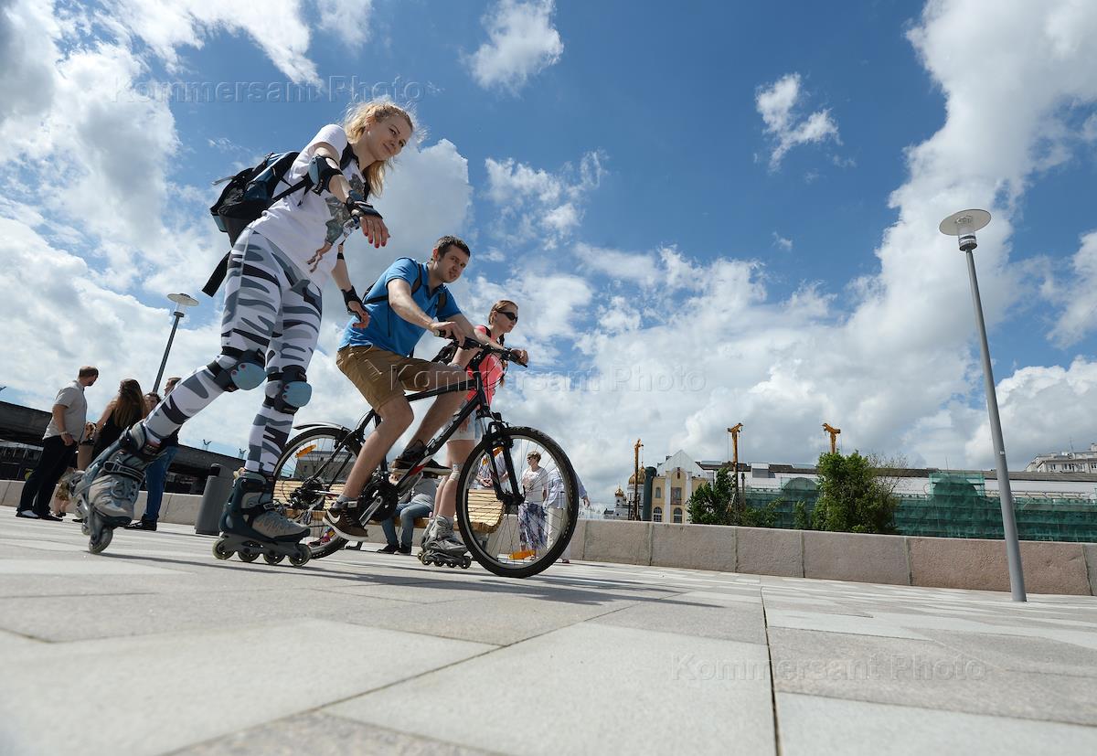 Жанровая фотография. Девушка на роликах и парень на велосипеде во время катания по Якиманской набережной.