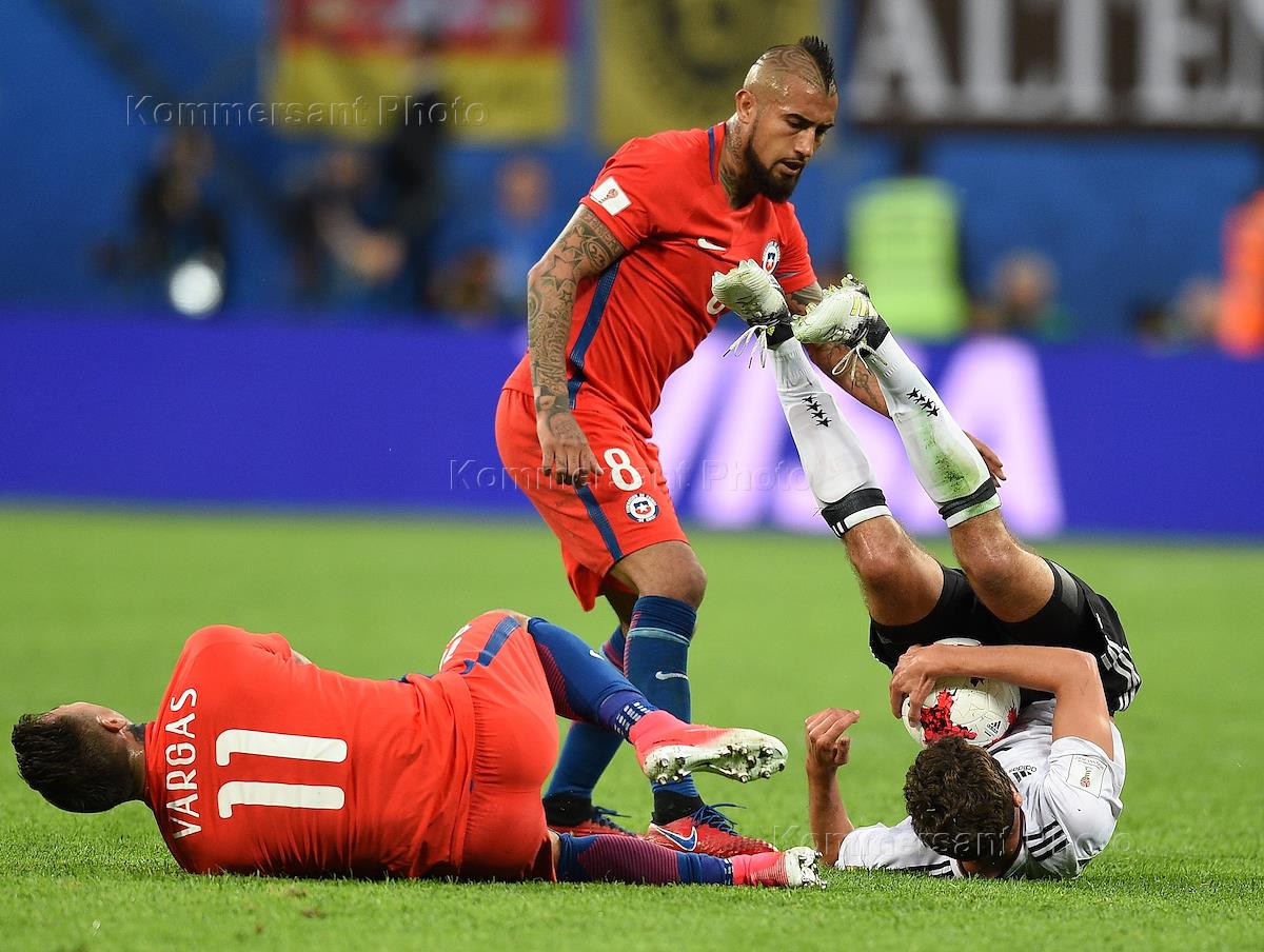 FIFA Confederations Cup Russia 2017. Final. Chile V Germany at Saint Petersburg Stadium. Germany's Antonio Ruediger (left) and Chile's Arturo Vidal (right) during the match.