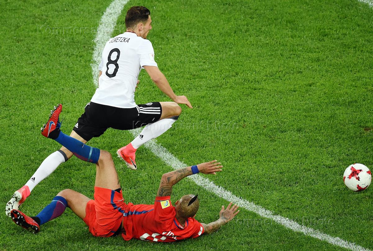 Кубок конфедераций FIFA 2017. Финал. Матч между сборными Чили и Германии на стадионе "Санкт-Петербург". Игрок сборной Германии Леон Горецка (слева) и игрок сборной Чили Артуро Видаль (справа) во время матча.
