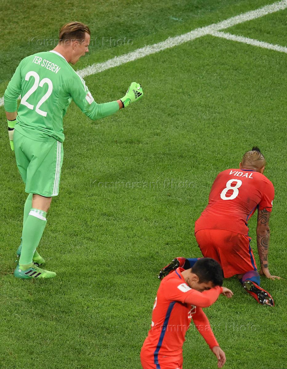 Кубок конфедераций FIFA 2017. Финал. Матч между сборными Чили и Германии на стадионе "Санкт-Петербург". Вратарь сборной Германии Марк-Андре тер Штеген (слева) и игрок сборной Чили Артуро Видаль (справа) во время матча.