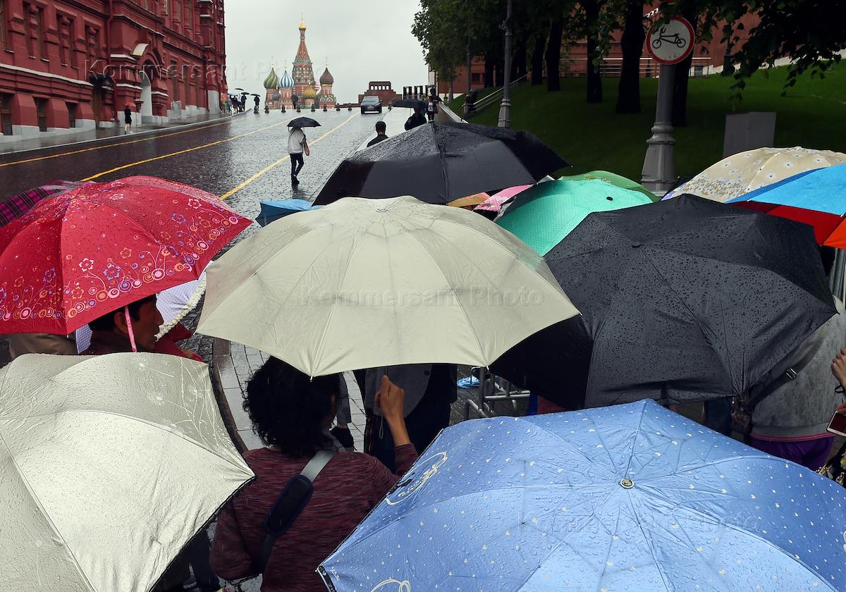 Жанровая фотография. Непогода в Москве. Туристы под зонтами на Красной площади.