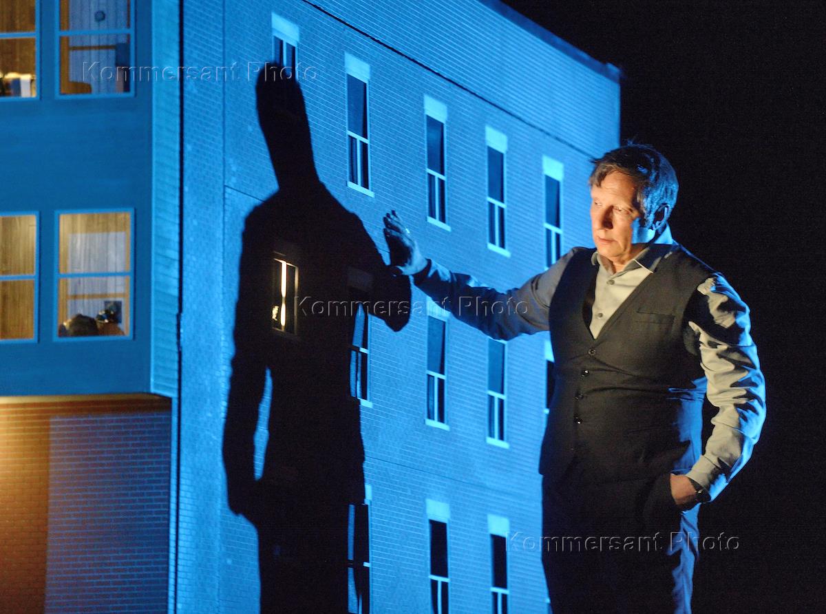 Chekhov International Theatre Festival 2017. The play "887" of the company "Ex Makina" (Quebec, Canada), directed by Robert Lepage, took place on the stage of the Theatre of Nations. The director and singer Robert Lepage during the performance.
