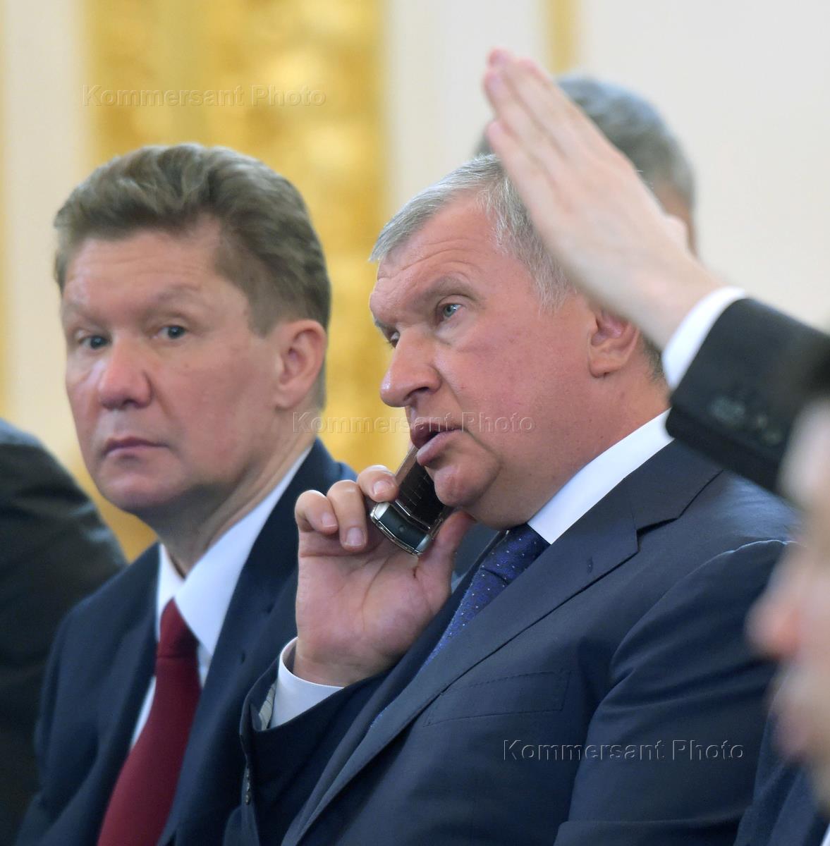 Встреча президента России Владимира Путина с председателем Китайской Народной Республики Си Цзиньпином прошла в Кремле. Председатель правления компании "Газпром" (Россия) Алексей Миллер (слева) и главный исполнительный директор, председатель правления ПАО "НК "Роснефть" Игорь Сечин (справа) во время встречи.