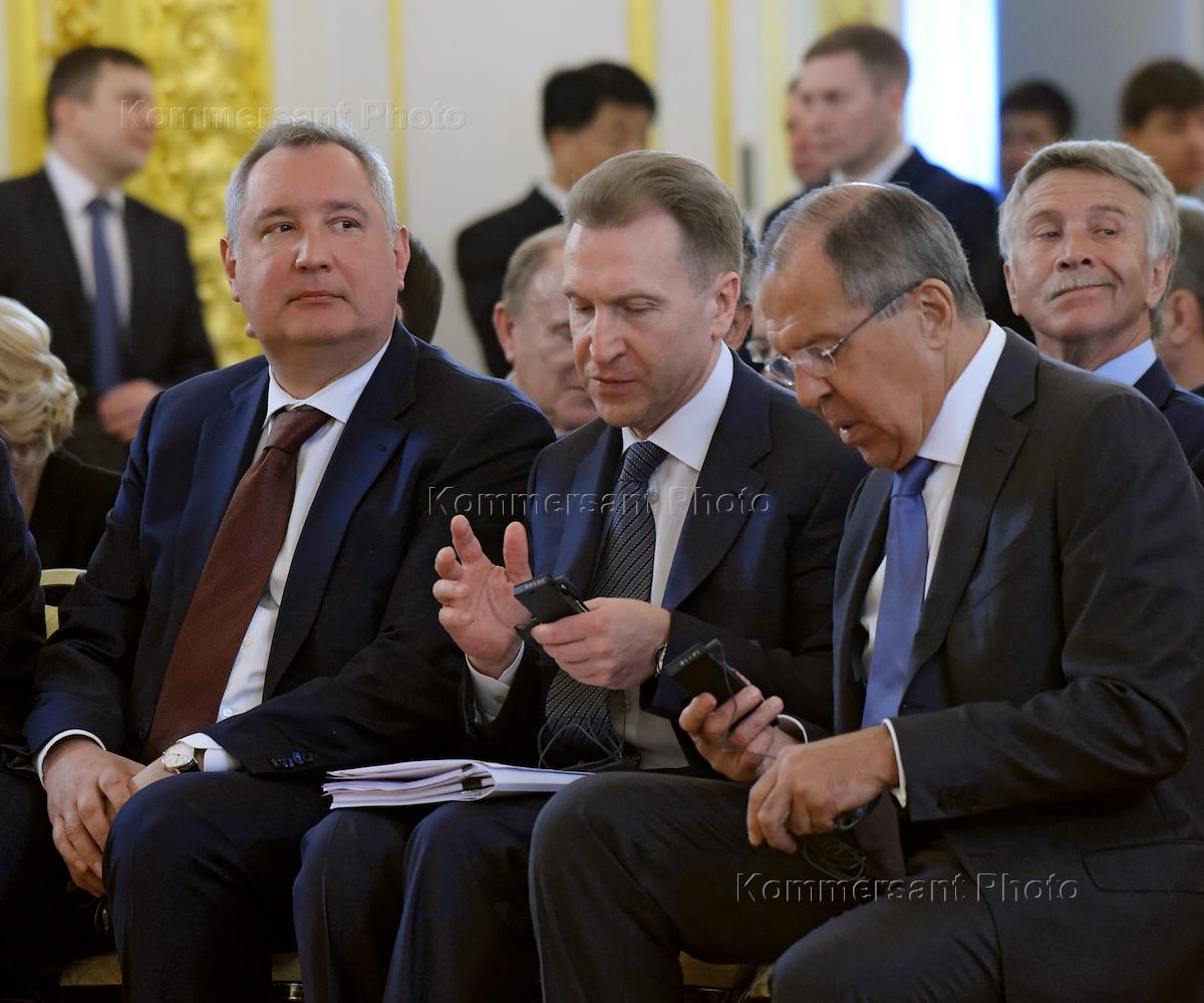 Встреча президента России Владимира Путина с председателем Китайской Народной Республики Си Цзиньпином прошла в Кремле. Слева направо: заместитель председателя Правительства России Дмитрий Рогозин, первый заместитель председателя Правительства России Игорь Шувалов, министр иностранных дел России Сергей Лавров и председатель правления ОАО "НОВАТЭК" Леонид Михельсон во время встречи.