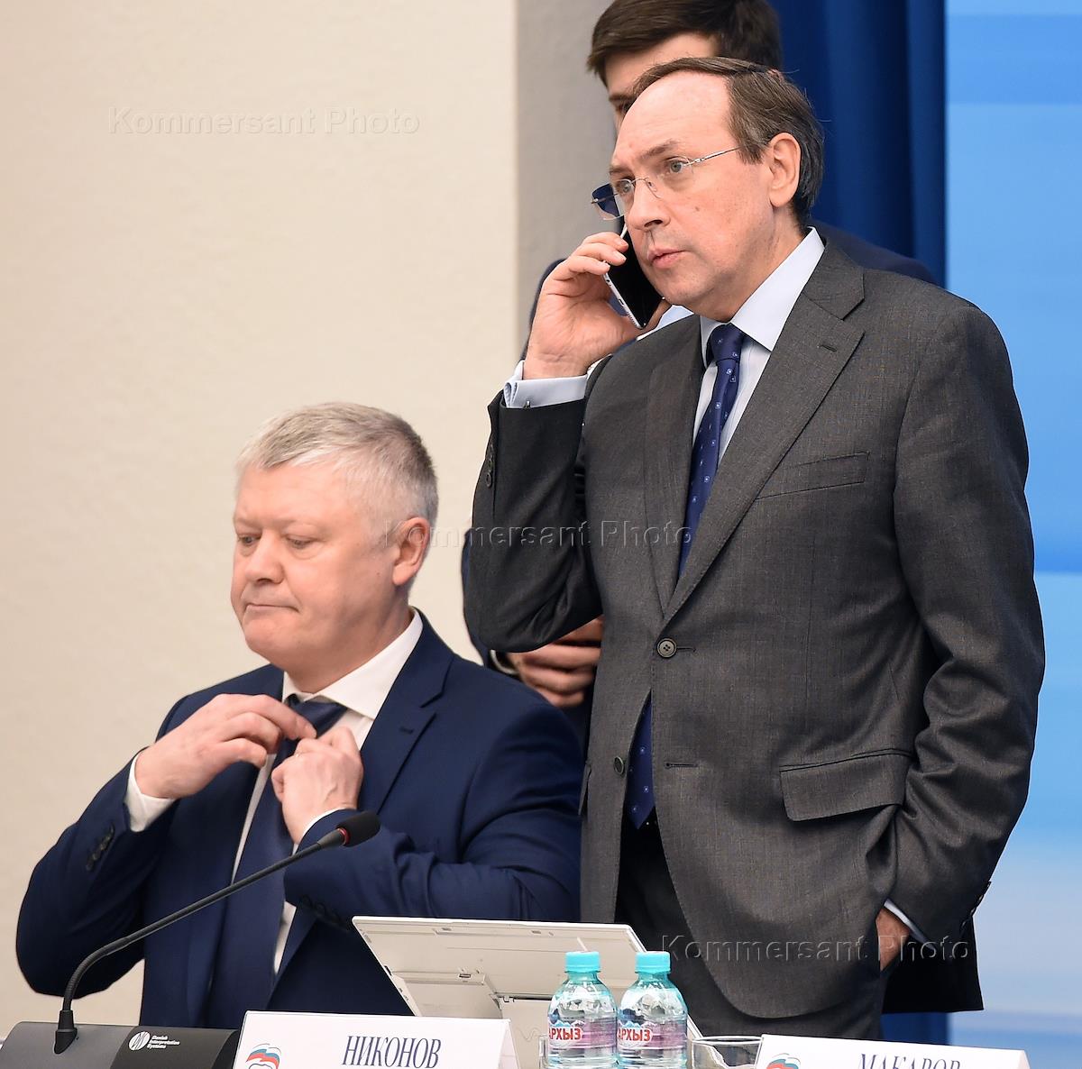 Заседание програмной комиссии партии "Единая Россия" на тему "Качество государства: эффективность власти и народный контроль". Председатель комитета Государственной думы (ГД) России по природным ресурсам, собственности и земельным отношениям Николай Николаев (слева) и председатель комитета ГД России по охране здоровья Дмитрий Морозов (справа) перед началом заседания.