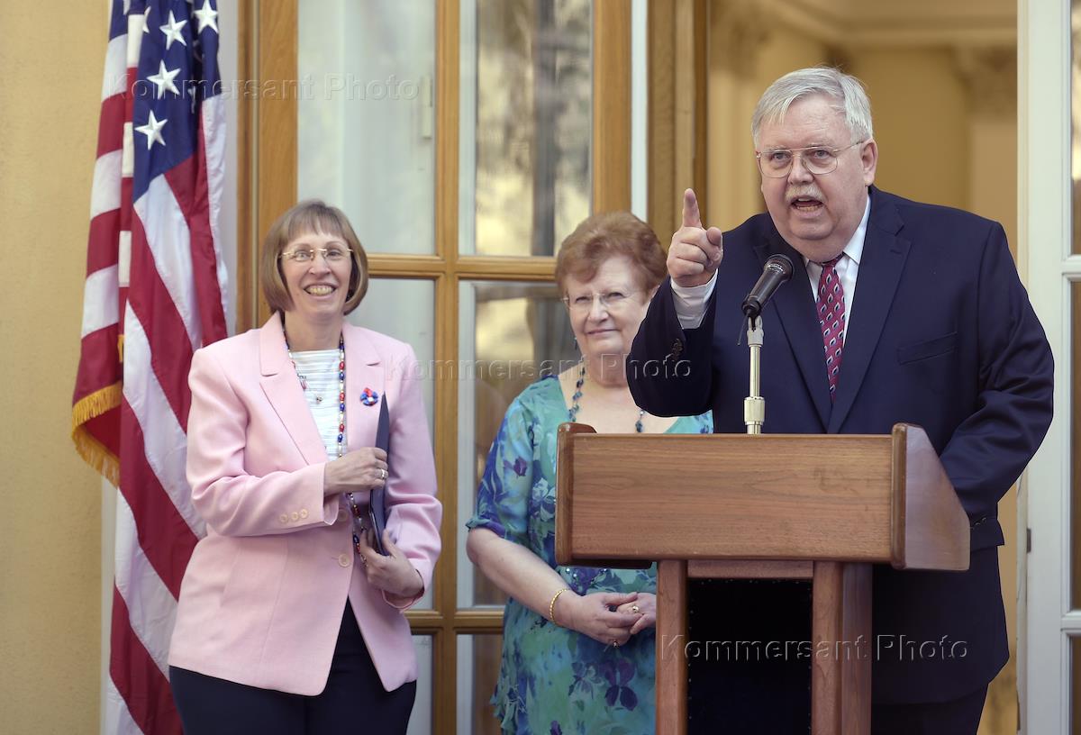 Торжественный прием по случаю празднования Дня Независимости США в резиденции посла Соединенных Штатов Америки в Москве. Посол США в России Джон Теффт (второй слева) и его супруга Мариэлла (слева) во время приема.