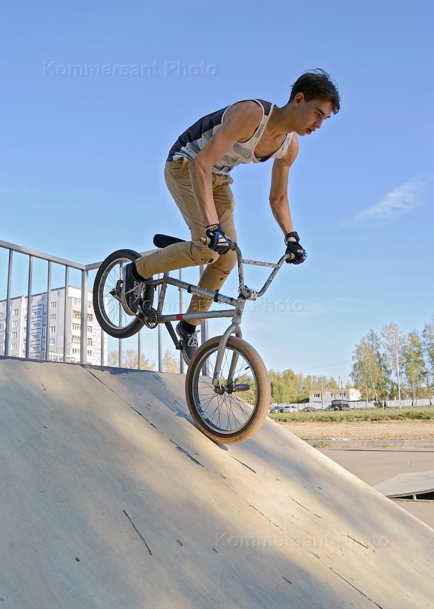 Подросток во время катания на велосипеде в скейтпарке спорткомплекса "Молодёжный".