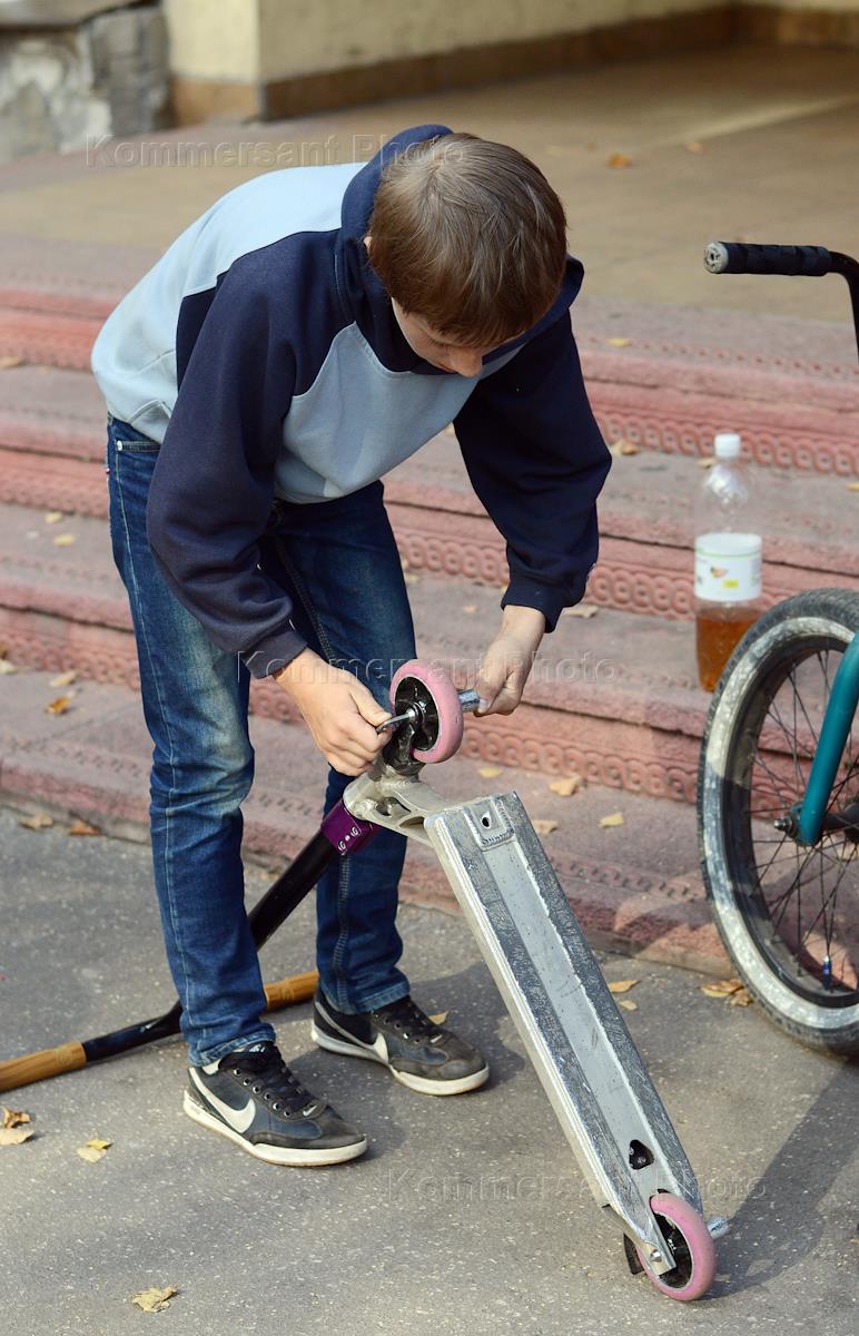 Подросток с самокатом в скейтпарке спорткомплекса "Молодёжный".