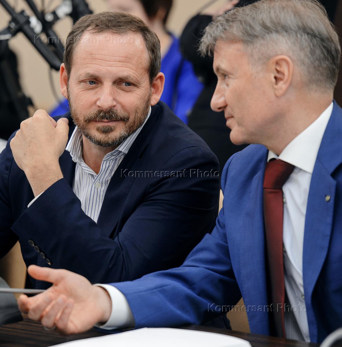 Заседание Совета при президенте России по стратегическому развитию и приоритетным проектам по программе "Цифровая экономика". Председатель правления Сбербанка России Герман Греф (справа) и генеральный директор компании "Яндекс" Аркадий Волож (слева) во время заседания.
