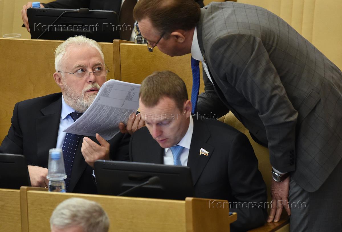 Пленарное заседание Государственной думы (ГД) России. Слева направо: председатель комитета ГД России по природным ресурсам, собственности и земельным отношениям Николай Николаев, член Комитета ГД России по бюджету и налогам Раиса Кармазина и член комитета ГД России по охране здоровья Татьяна Соломатина перед началом заседания.