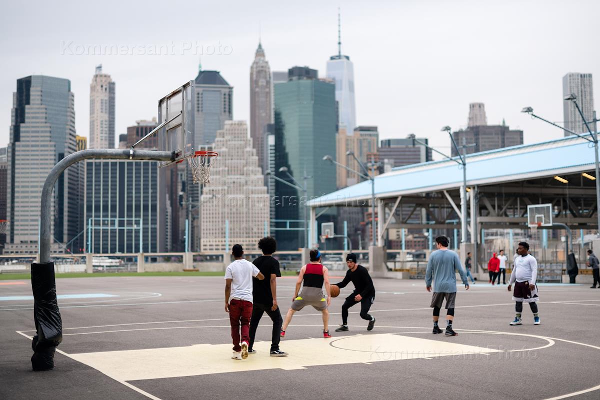 Жанровая фотография. Молодые люди играют на открытой спортивной площадке в баскетбол.
