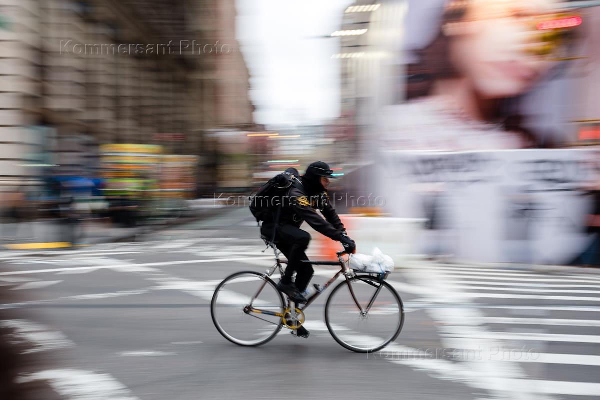 Genre photography. Views of New York. Cyclist during a ride on Broadway.