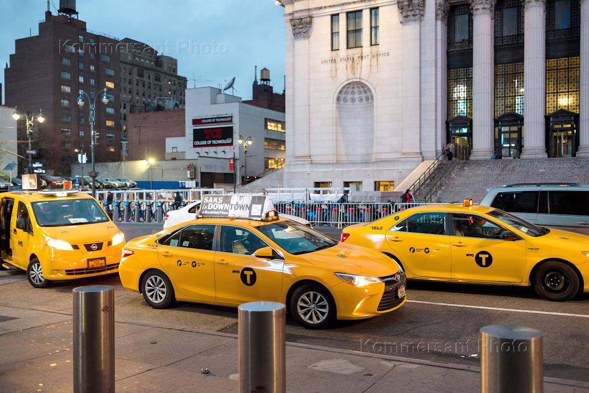 Genre photography. Views of New York. Yellow taxi cabs and the Main Post Office on the background.