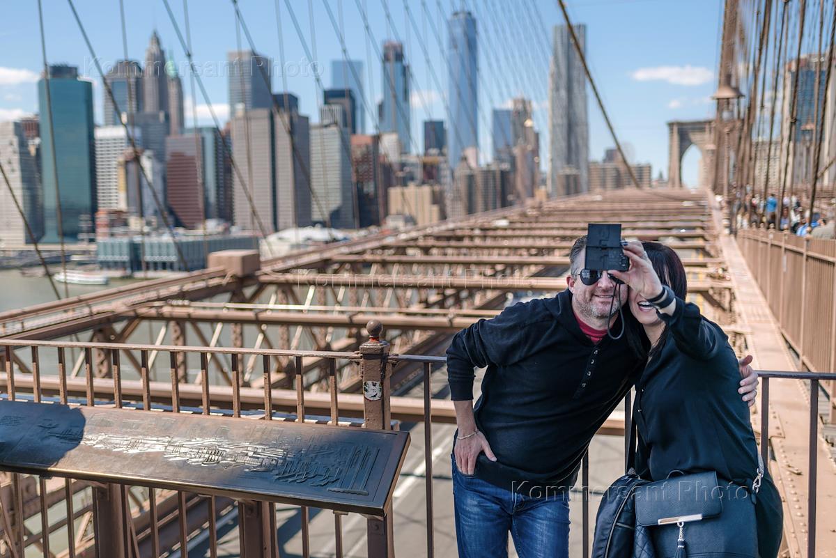 Жанровая фотография. Молодые люди на берегу пролива Ист-Ривер на фоне Манхеттенского моста.