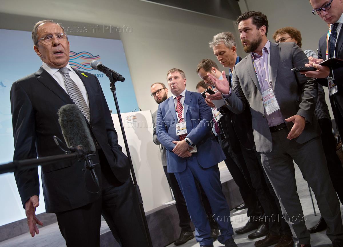 Саммит G20. Министр иностранных дел России Сергей Лавров перед пресс-брифингом по итогам встречи президента России Владимира Путина и президента США Дональда Трампа на саммите "Группы двадцати".