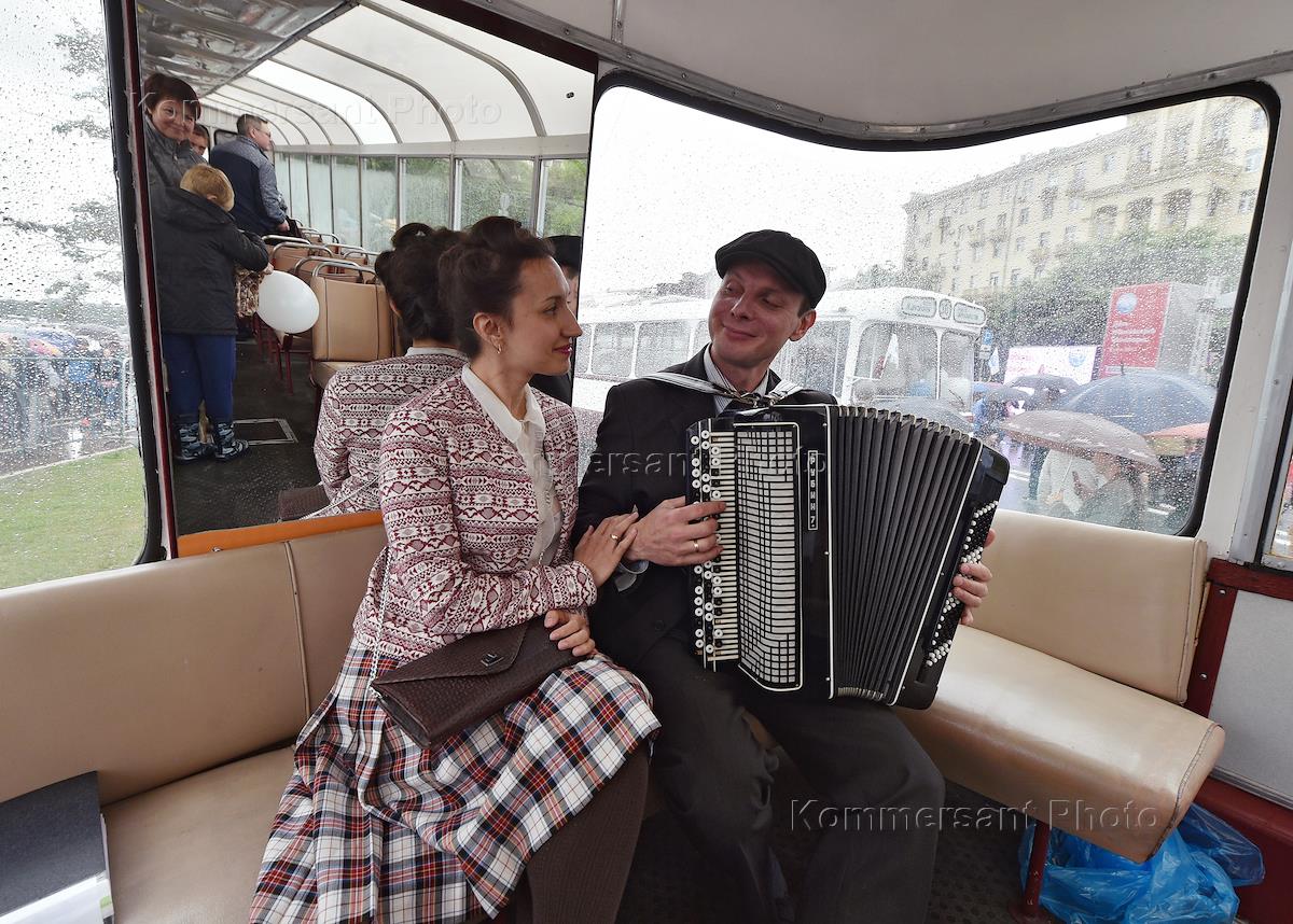 День Московского транспорта отметили на Фрунзенской набережной и в парке Горького. Посетители с гитарой поют песни в салоне автобуса во время презентации ретро-техники и моделей наземного городского транспорта.
