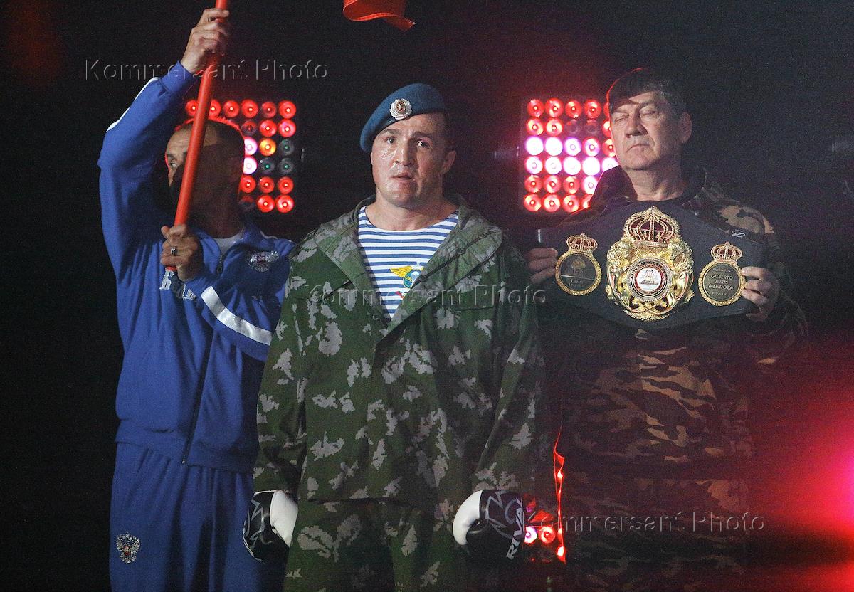 Боксерский поединок за звание чемпиона мира по боксу среди профессионалов в тяжелом весе по версии Всемирной боксерской ассоциации WBA состоялся во Дворце игровых видов спорта. Российский боксер Денис Лебедев (в центре) перед началом поединка.