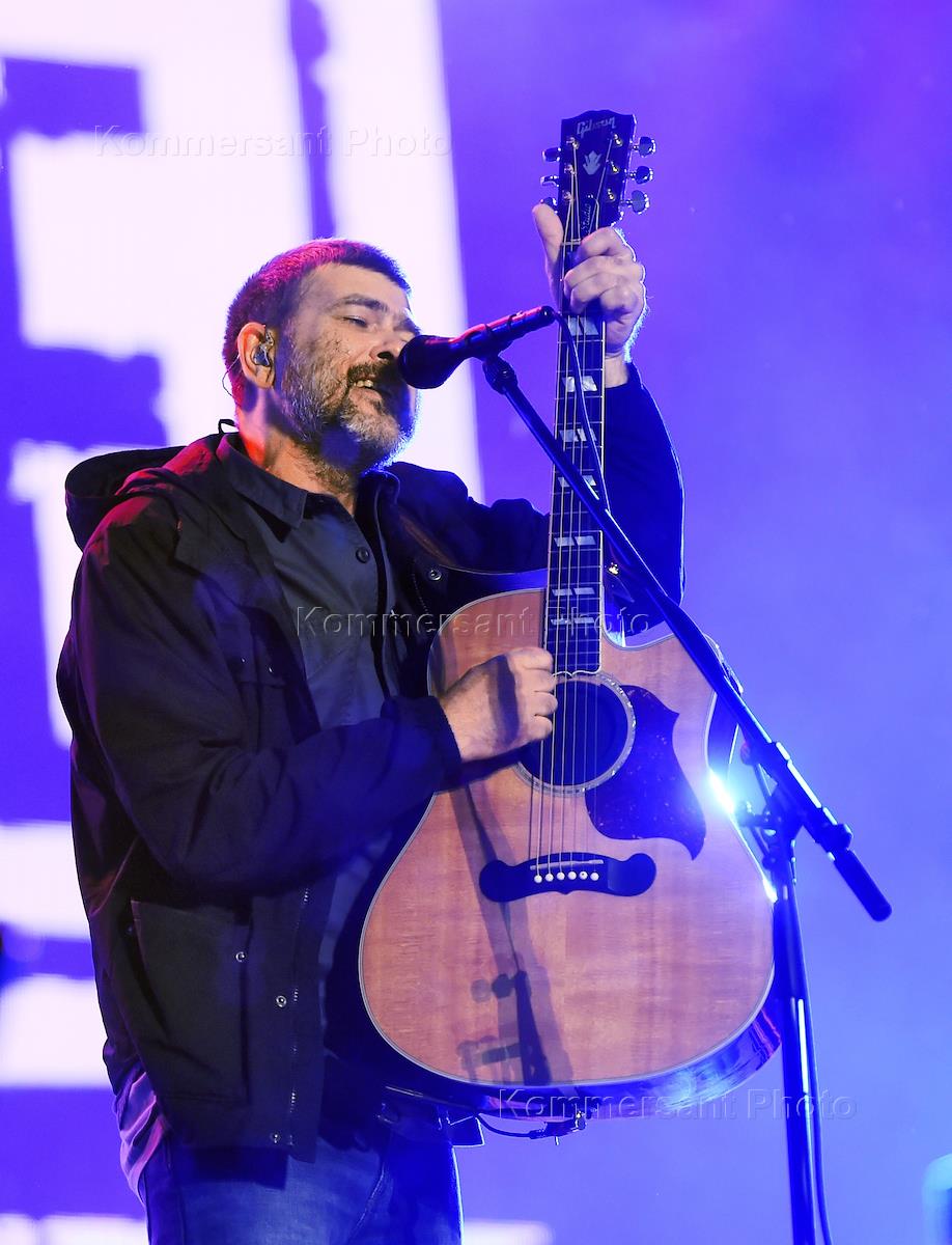 The 17th annual rock music festival "Nashestvie" in the village of Bolshoe Zavidovo. The leader vocalist of "Splin" band Aleksandr Vasiliev during the performance at the festival.