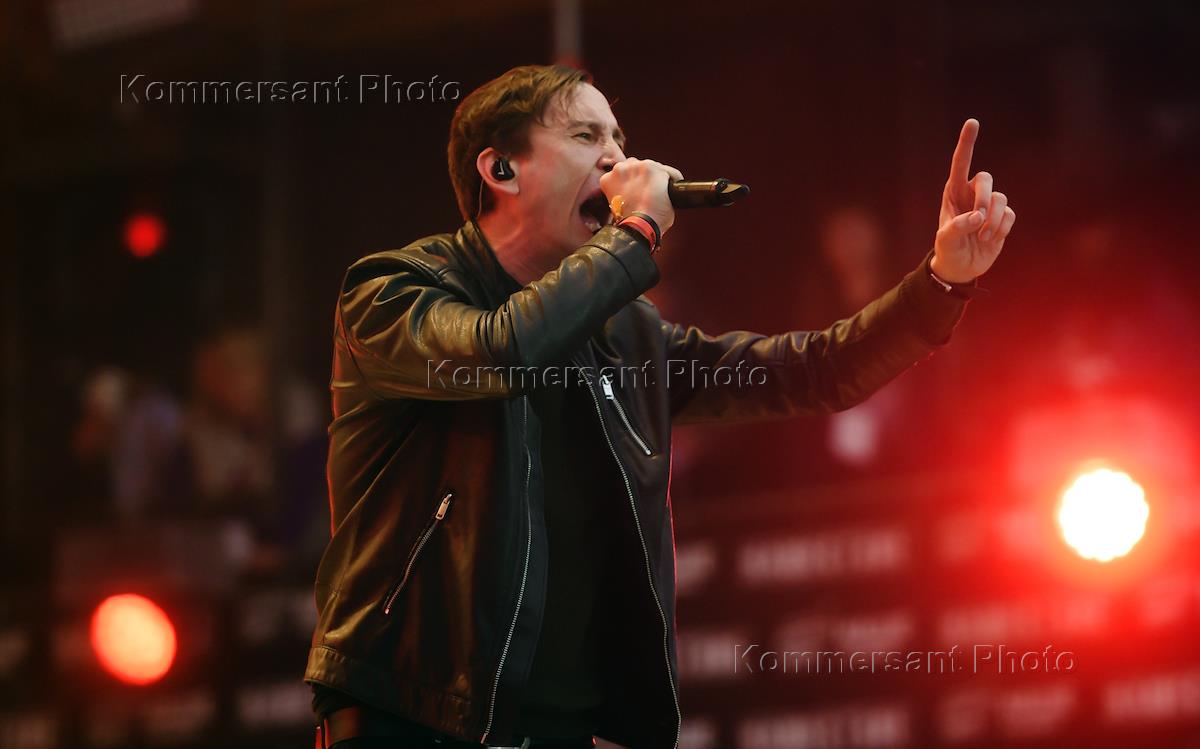 The 17th annual rock music festival "Nashestvie" in the village of Bolshoe Zavidovo. The vocalist of "LUMEN" rock band Rustem "Tem" Bulatov during his performance at the festival.