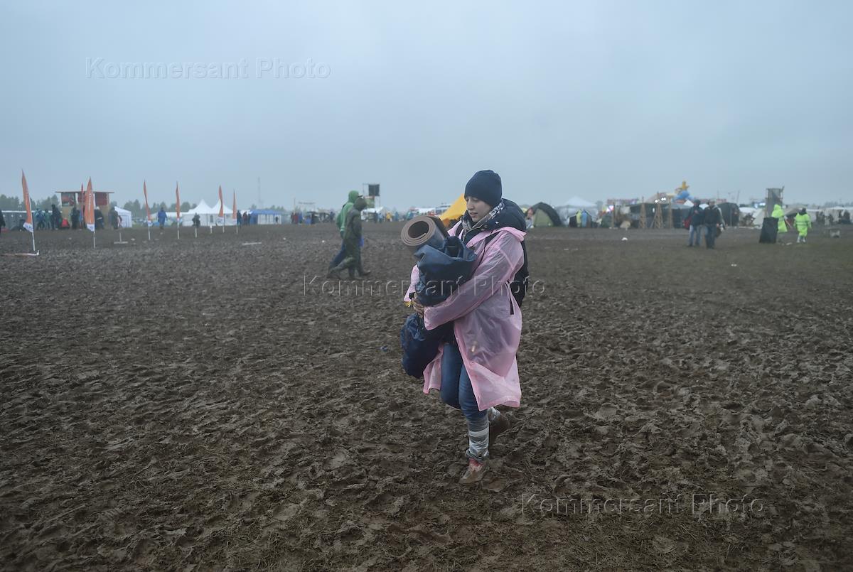 Музыкальный рок-фестиваль "Нашествие" состоялся в 17-й раз в поселке Большое Завидово. Участники фестиваля идут по грязному полю.