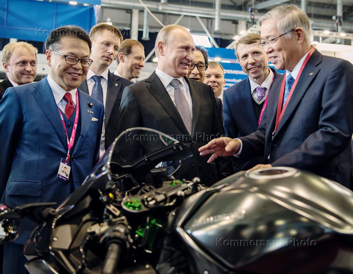 8th international industrial exhibition "Innoprom - 2017" was held in international exhibition center "Ekaterinburg-EXPO". Russian President Vladimir Putin (centre), Minister of cooperation with Russia in the field of Economics, Hiroshige Seko (left) and Chairman of the Board of Directors of the Japanese organization on development of foreign trade "JETHRO", Ishige Hiroyuki (right) during a visit of the exposure of Japan.