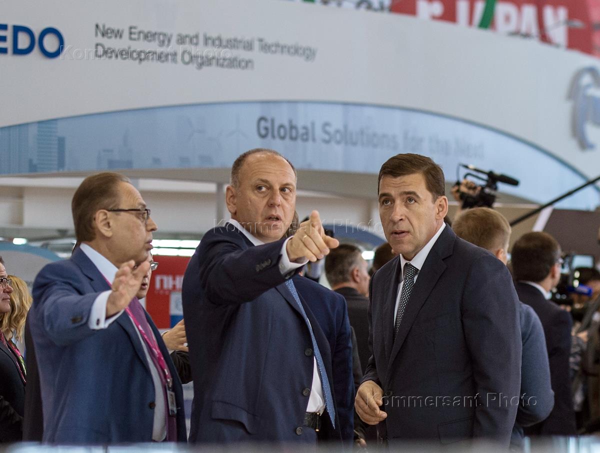 8-я международная промышленная выставка INNOPROM. Председатель совета директоров холдинга "Трубная металлургическая компания" (ТМК) Дмитрий Пумпянский (в центре) и временно исполняющий обязаности губернатора Свердловской области Евгений Куйвашев (справа) во время выставки.