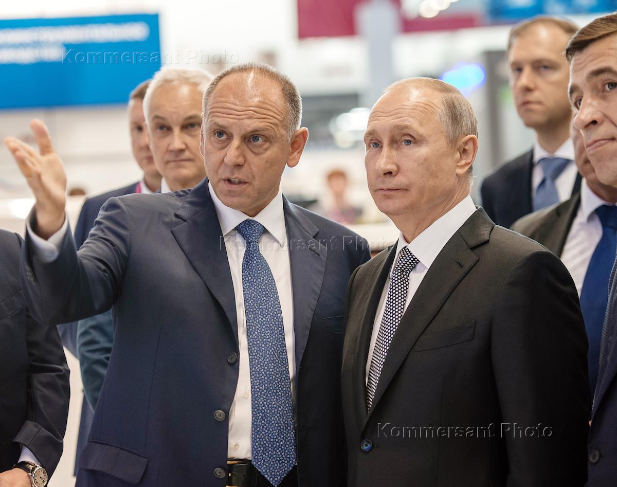 8th international industrial exhibition "Innoprom - 2017" was held in international exhibition center "Ekaterinburg-EXPO". The President of Russia Vladimir Putin (right)and Chairman of the Board of the Directors of the holding "Pipe Metallurgical Co.," Dmitry Pumpyansky (left) during the exhibition.