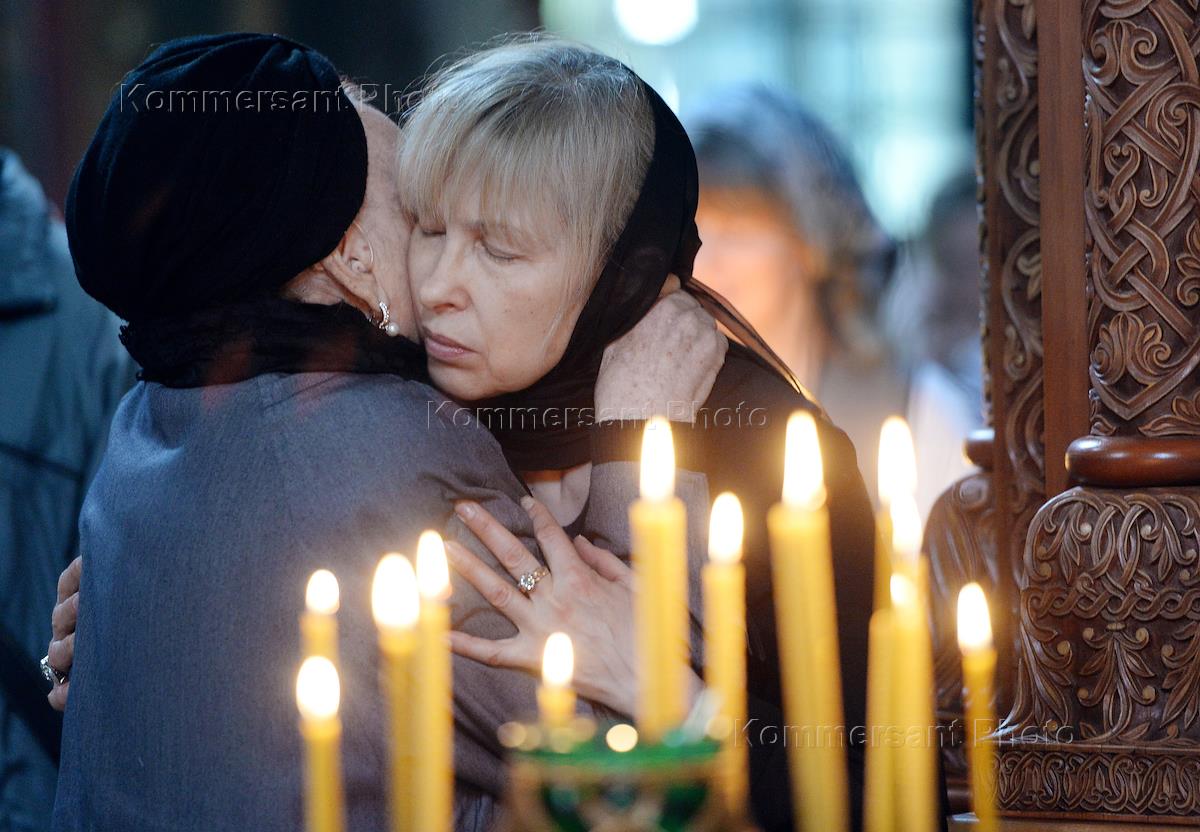 Церемония прощания с художником Ильей Глазуновым прошла в соборе Сретенского монастыря. Президент Фонда Святослава Федорова Ирэн Федорова (слева) и вдова художника Ильи Глазунова, директор картинной галереи Глазунова Инесса Орлова (справа) во время церемонии прощания.