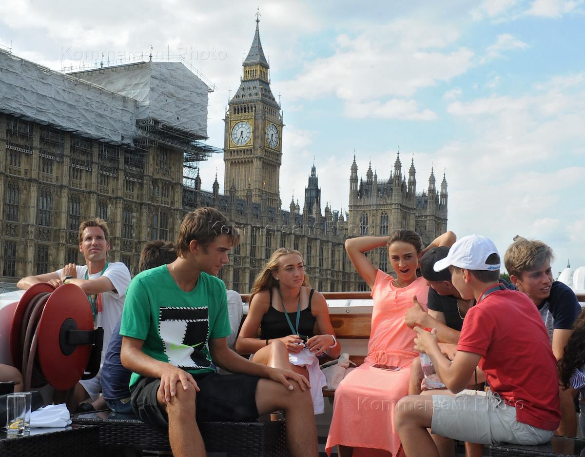 Виды Лондона. Туристы на фоне архитектурного комплекса Вестминстерского дворца во время прогулки по Темзе. Башня с часами "Биг-Бен".