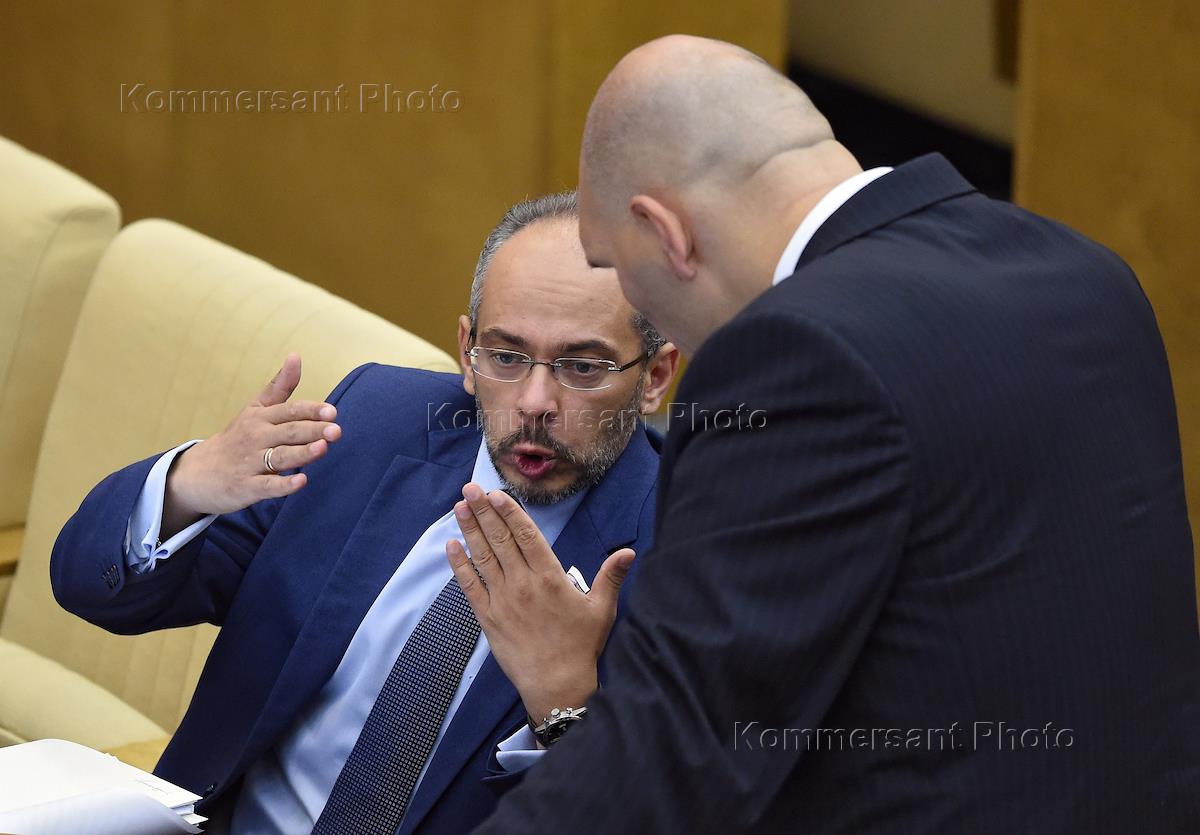 Plenary session of the State Duma of Russian Federation.The Member of the Committee of Russia's state Duma on the Federal Structure and questions of local self-government Alexander Pyaticop (left) and Committee member of the Russian state Duma on state building and law, Tatyana Kasaeva (right) during the session.