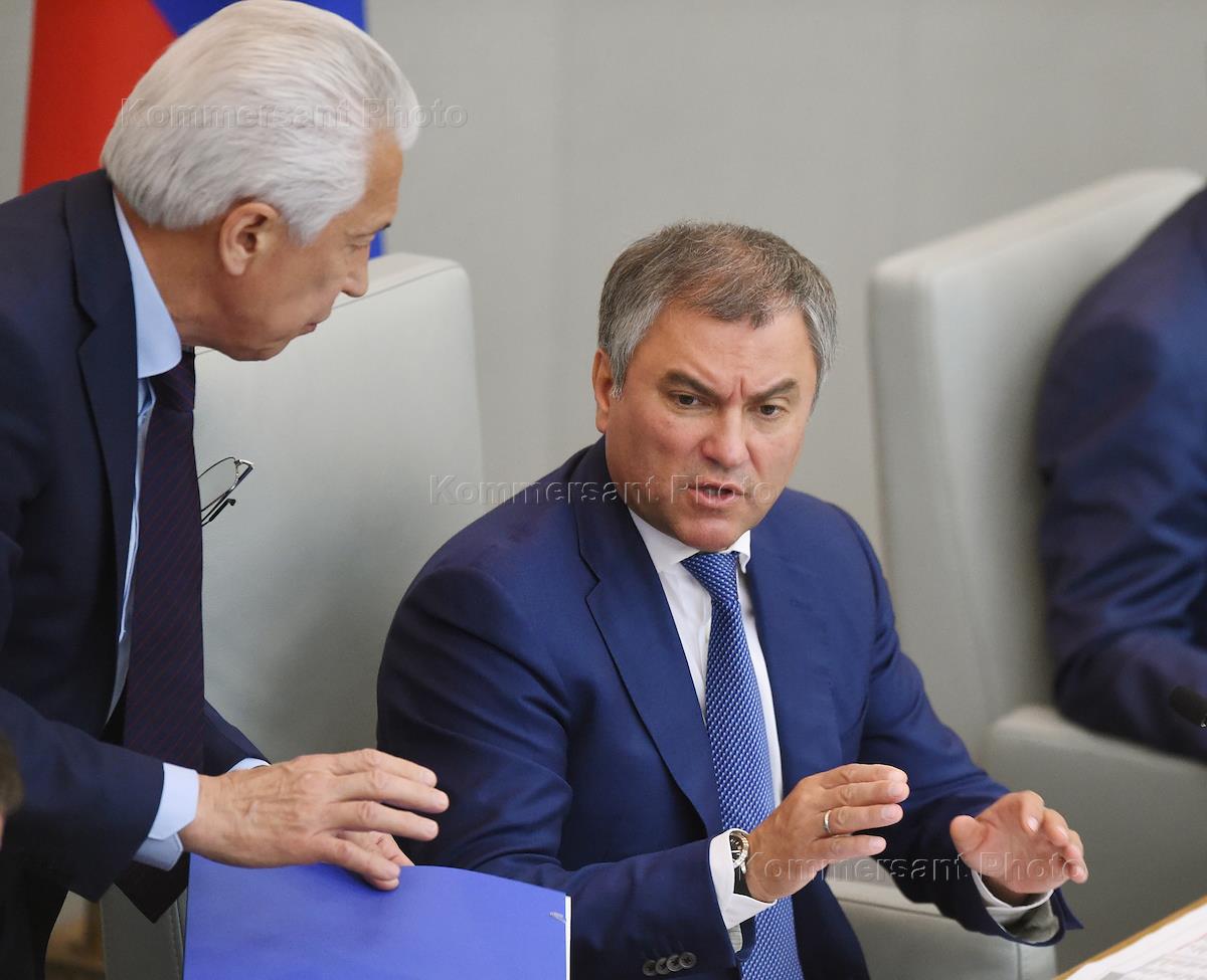 Пленарное заседание Государственной думы (ГД) России. Председатель ГД России Вячеслав Володин (слева) и член комитета ГД России по труду, социальной политике и делам ветеранов Андрей Исаев (справа) во время заседания.