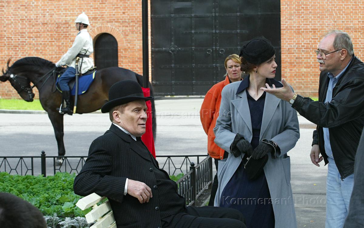 Режиссер Владимир Бортко (слева) и актеры Александр Филиппенко (в центре) и Анна Ковальчук (справа) на съемках фильма "Мастер и Маргарита" по роману писателя Михаила Булгакова в Александровском саду.