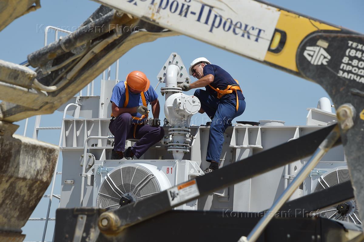 Строительство Симферопольской ПГУ-ТЭС вблизи поселка Строгановка. Рабочие на строительной площадке.