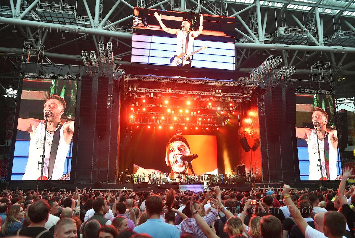 Концерт группировки "Ленинград" прошел на стадионе "Открытие Арена". Солист группы Сергей Шнуров (в центре) во время концерта.