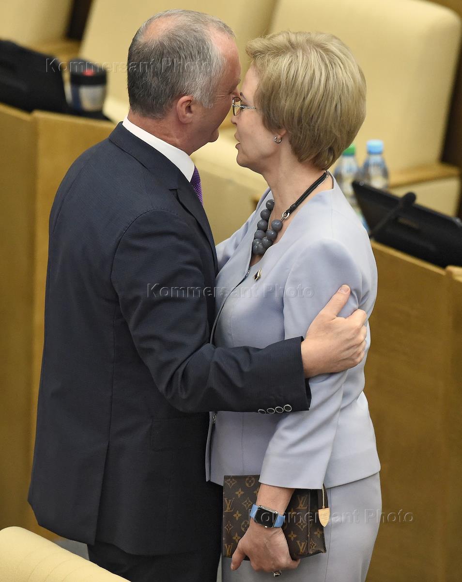 Пленарное заседание Государственной думы (ГД) России. Председатель комитета ГД России по регламенту и организации работы Государственной Думы Ольга Савастьянова (слева) и председатель комитета ГД России по природным ресурсам, собственности и земельным отношениям Николай Николаев (справа) во время заседания.