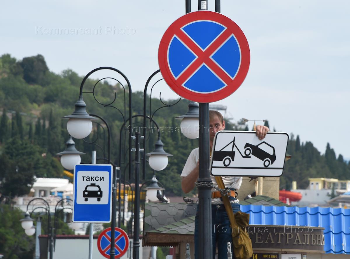 Жанровая фотография. Установка дорожного знака "Парковка запрещена" на одной из улиц Алушты.