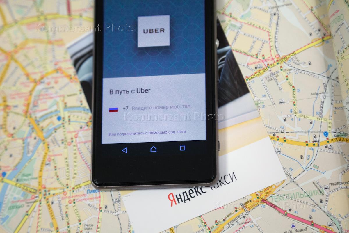 Жанровая фотография. Сервисы такси. Страница Uber на экране мобильного телефона, рекламный листок "Яндекс.Такси", карта Москвы.