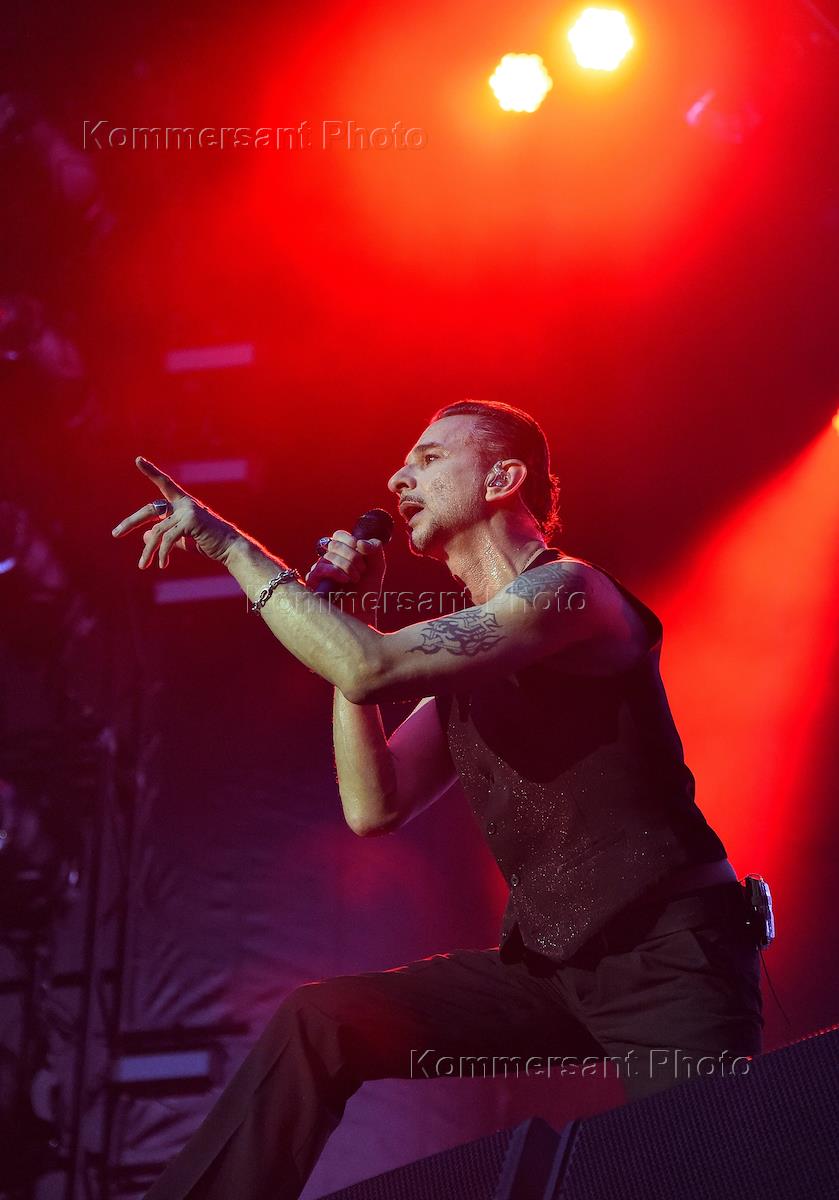 British rock band Depeche Mode concert at Otkrytie Arena. Dave Gahanb - leader vocalist during the performance.