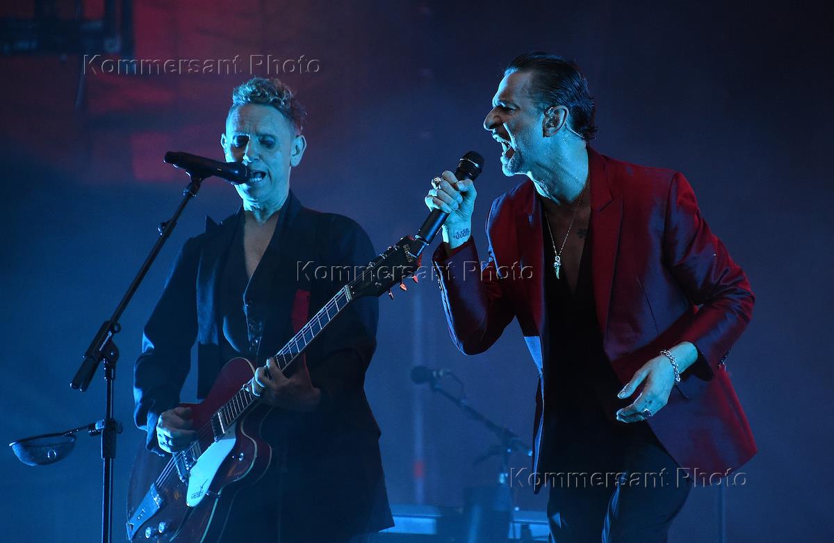 British rock band Depeche Mode concert at Otkrytie Arena. Guitarist Martin Gore (left) and leader vocalist Dave Gahanb (right) during the performance.