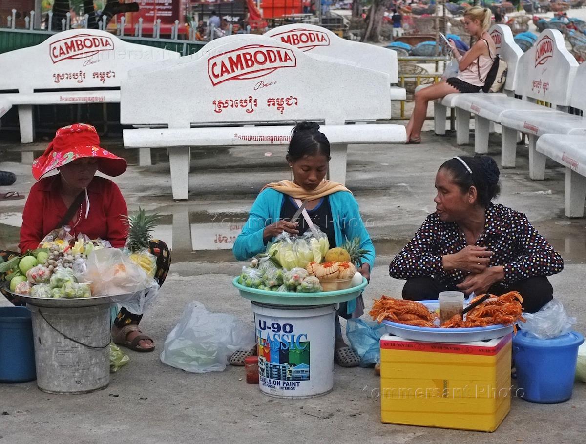 Жанровые фотографии. Камбоджа. Провинция Сиануквиль. Отдыхающие на пляже и торговка креветками.