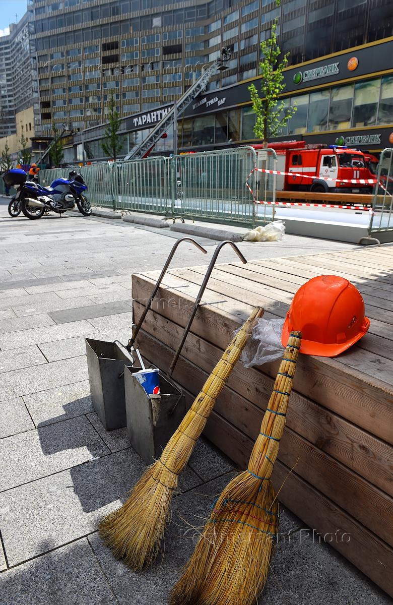 Пожар в здании на Новом Арбате, 17. Жанровая фотография. Веник, каска, совок.