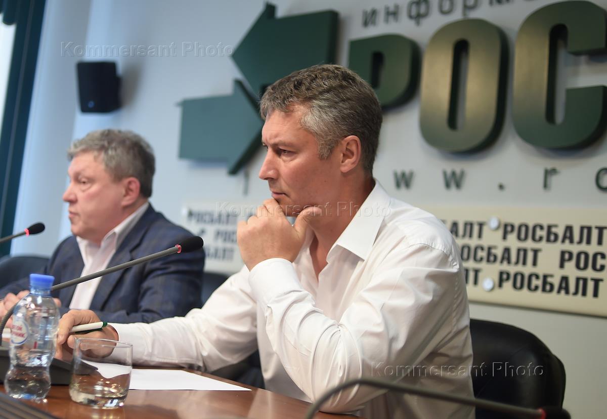 Пресс-конференция партии "Яблоко" и Евгения Ройзмана о выборах губернатора Свердловской области" в информационном агентстве "Росбалт". Председатель Федерального политического комитета партии "Яблоко" Григорий Явлинский (слева) и председатель городской думы Екатеринбурга Евгений Ройзман (справа) во время пресс-конференции.