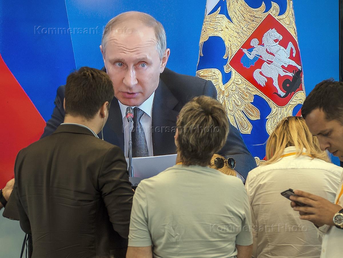 International aviation and space salon MAKS-2017. The translation on the TV the speech of Russian President Vladimr Putin on the show.