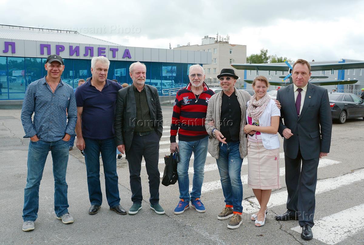 XIX Всероссийский Шукшинский кинофестиваль. Актеры иван Кокорин (слева), Анатолий Котенев (второй слева), сценарист Виктор Мережко (в центре) и музыкант Гарик Сукачев (третий справа) во время прибытия на фестиваль в аэропорту.
