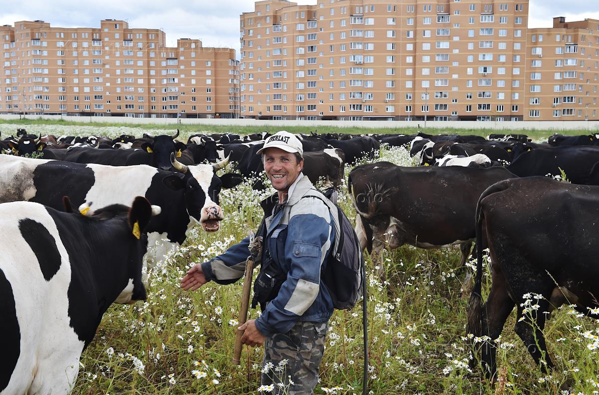 Научно-экспериментальное хозяйство "Снегири". Жанровая фотография. Пастух пасет стадо коров на лугу вблизи района многоэтажек.